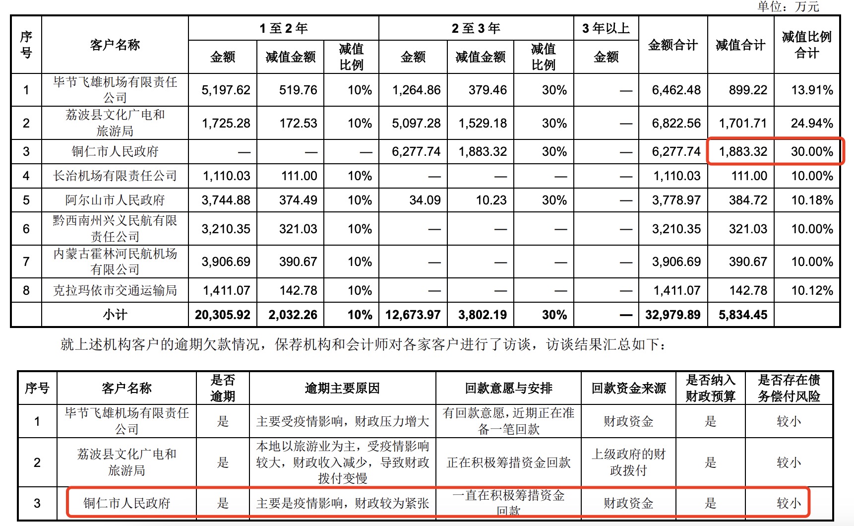 当时,华夏航空一并披露了8位长账龄应收帐款的客户情况,其中减值比例、减值金额最高的均为铜仁市人民政府。铜仁市政府当时也解释称因疫情影响财政紧张,回款资金已经纳入财政预算,将积极筹措资金回款。