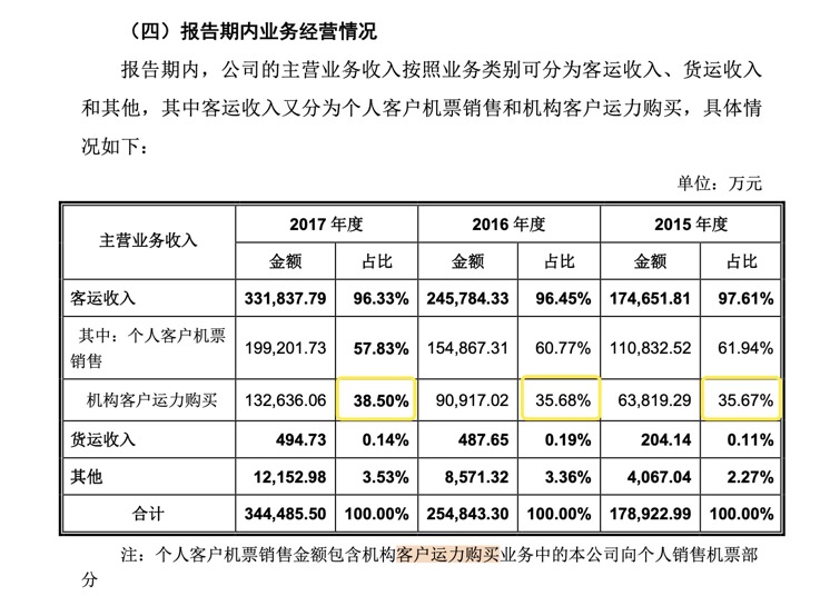2015年~2017年,华夏航空机构客户运力购买业务收入占到主营业务收入比例分别为35.67%、35.68%和38.50%。