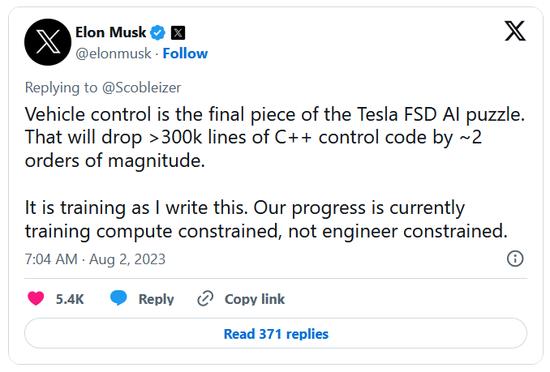 马斯克8月2日发文称,车辆控制是FSD最后一块拼图。