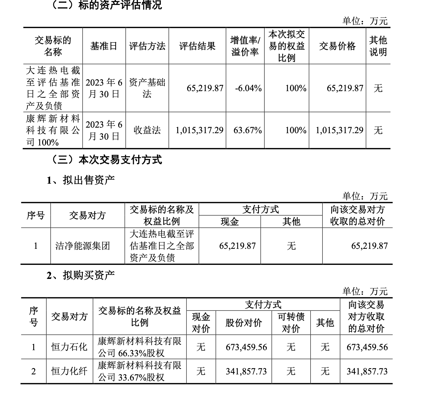 根据此次《重大资产出售及发行股份购买资产并募集配套资金暨关联交易报告书》,大连热电的全部资产及负债的交易价格为6.52亿元,溢价率为-6.04%;收购康辉新材的价格则为101.53亿元,溢价率为63.67%,全部由大连热电以4.42元/股的价格向恒力石化与恒力化纤发行股份而来。