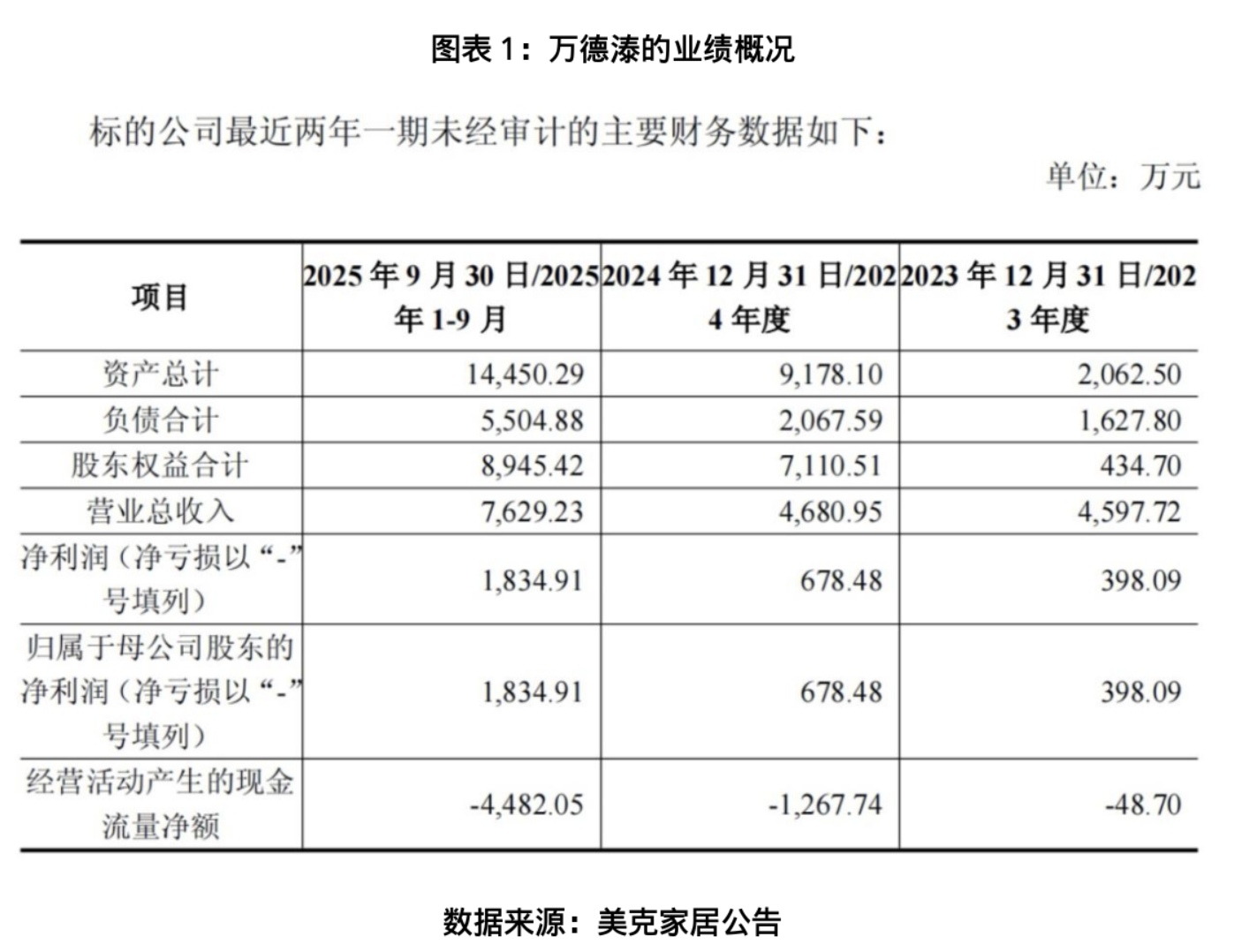 在财务数据层面,近年来万德溙的业绩呈快速增长态势。公告显示,2023年至2025年前9月,万德溙的营业收入从4597.72万元增至7629.23万元,净利润从398.09万元增至1834.91万元,从表面来看是一家具备成长潜力的科技标的。
