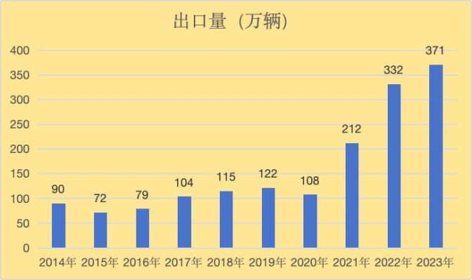 在2021年,我国汽车出口量首次突破200万辆,达到212万辆,同比实现96.3%的增长。这一增势在随后的2年时间内得以持续:2022年我国汽车出口量达到332万辆;到了2023年,仅前三季度的汽车出口量便超过去年全年,达到371万辆。