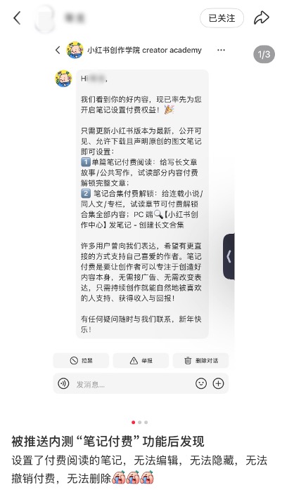 据收到内测邀请的博主反馈,设置付费阅读的笔记,便再“无法编辑,无法隐藏,无法撤销付费,无法删除。”