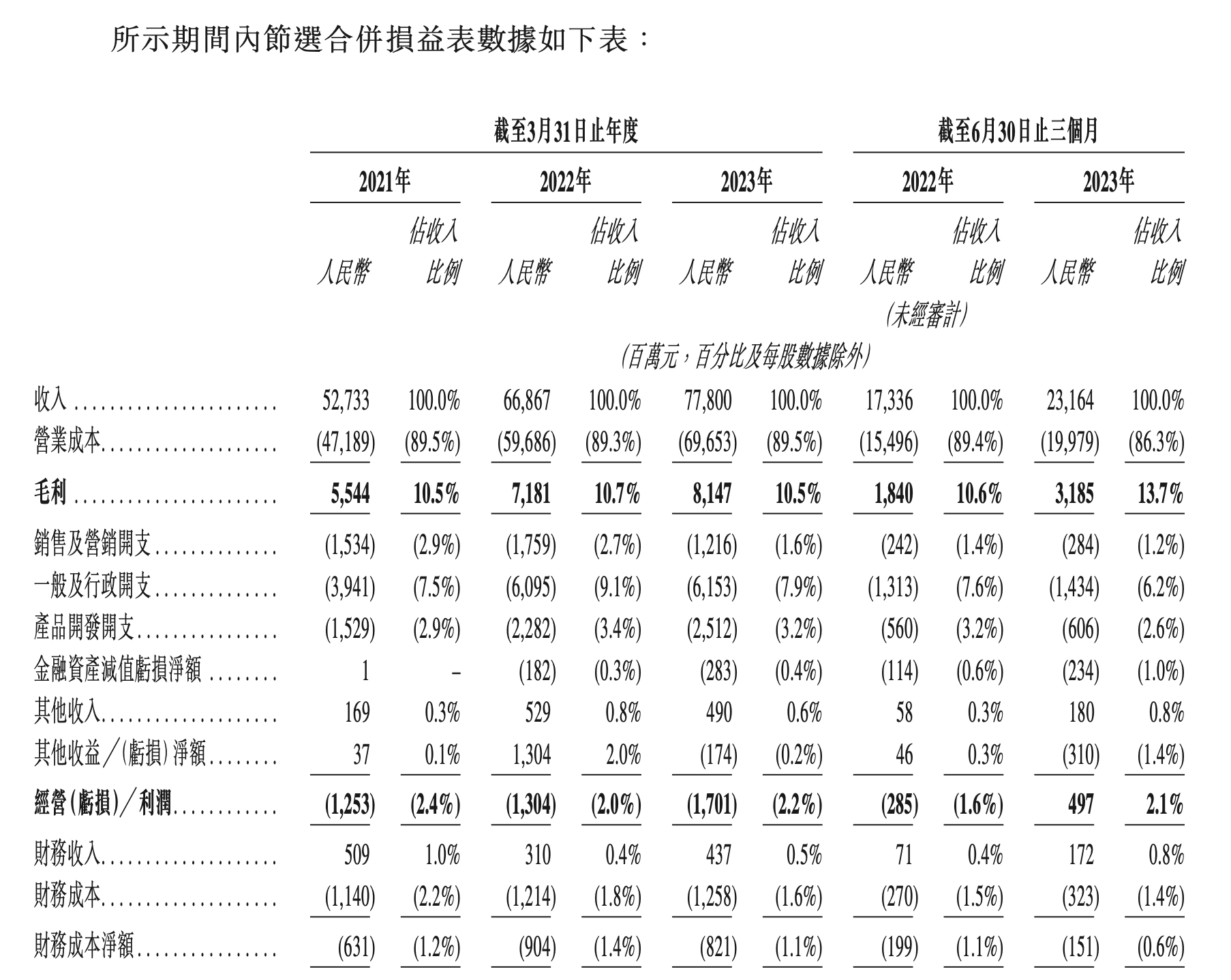 数据显示,2021财年至2023财年(截至3月31日的年度),菜鸟分别实现收入527.33亿元、668.67亿元和778.00亿元,同期录得净亏损分别为20.15亿元、22.86亿元和28.01亿元;毛利率分别为10.5%、10.7%和10.5%。