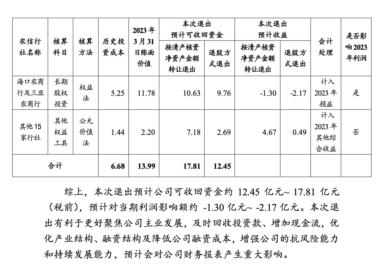 而据公告披露,-1.3亿元~-2.17亿元的影响金额正是来源对出让海口农商行及三亚农商行的相关测算。