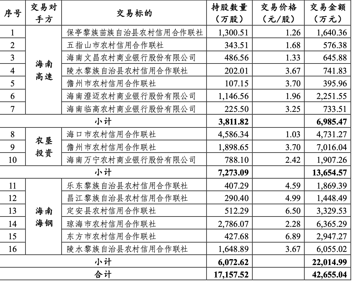 具体来看,罗牛山向海南高速转让保亭黎族苗族自治县农信联社、五指山市农信联社、文昌农商行、黎族自治县农信联社、儋州市农信联社、澄迈农商行、临高农商行共7家机构的3811.82万股股权,交易金额约6985.47万元。