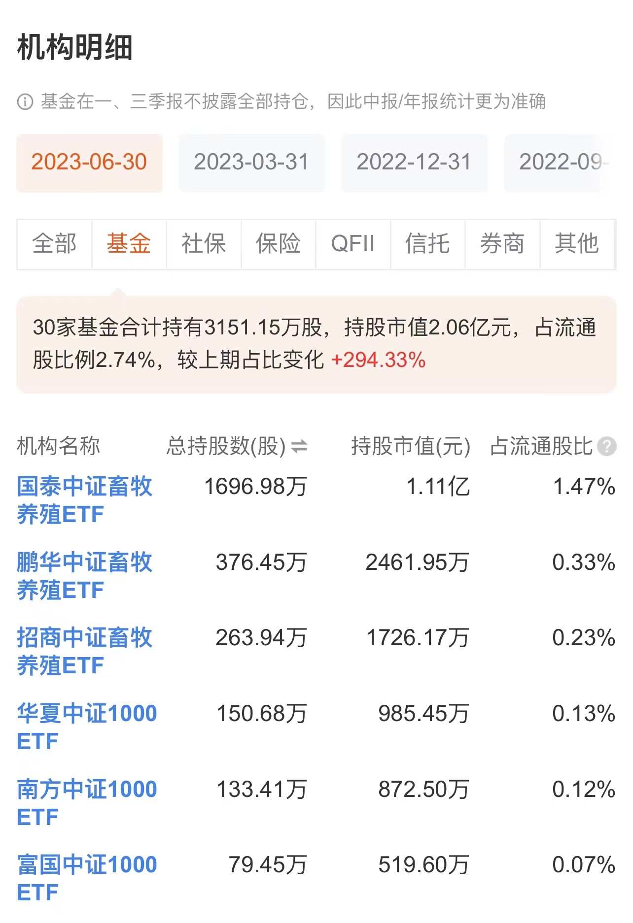 机构持仓方面,Choice数据显示,截至2023年6月末,共有30家基金持有罗牛山,合计持股数量为3151.15万股,占其流通股比例为2.74%,持股市值为2.06亿元。