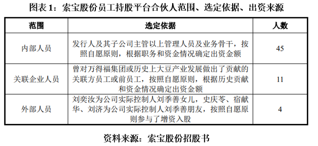 如图表1所示,索宝股份披露称,11名关联企业人员的选定依据为曾对万得福集团或历史上大豆产业发展做出了贡献的关联方员工或前员工,按照自愿原则,根据历史贡献和资金情况确定出资金额。