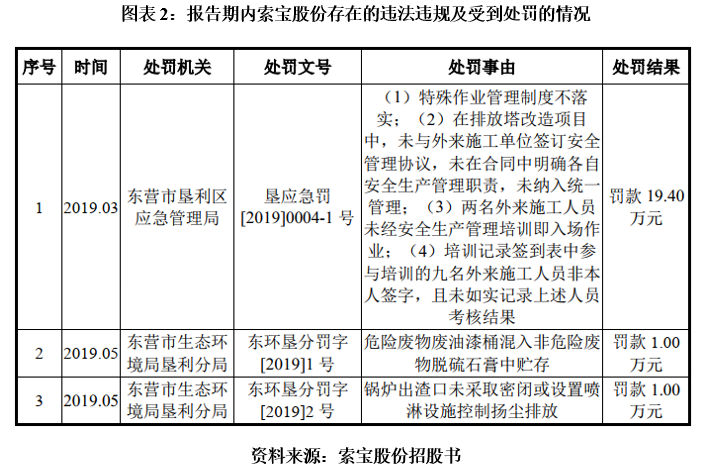 此外,如图表2所示,2019年,因特殊作业管理制度不落实、危险废物废油漆桶混入非危险废物脱硫石膏中贮存、锅炉出渣口未采取密闭或设置喷淋设施控制扬尘排放等违法违规行为,索宝股份接连受到3次行政处罚,处罚金额合计为21.4万元。