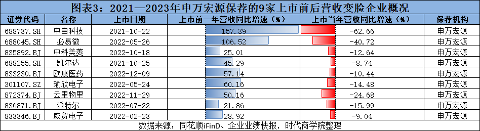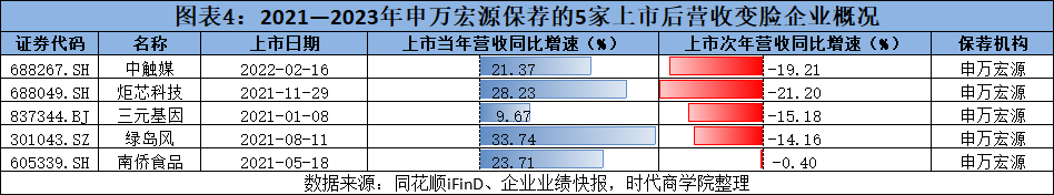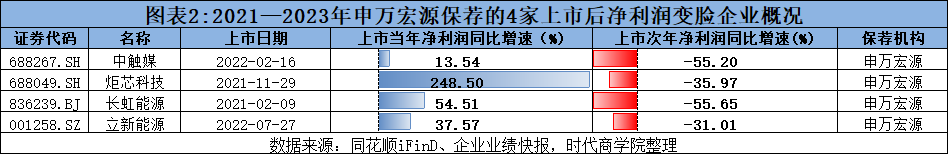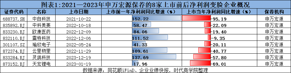 Wind数据显示,2021—2023年,申万宏源共保荐40家公司成功上市,其中,有8家公司上市当年净利润就变脸(即上一年增长,上市当年下滑),占比达20%。