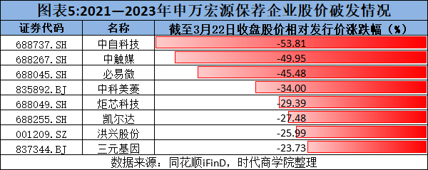 同花顺iFinD数据显示,截至3月22日,在申万宏源保荐的上述40家上市企业中,破发的企业高达17家,占比达42.5%。其中,上市后业绩变脸的企业有11家,且破发比例排名前八的企业均为业绩变脸的企业。