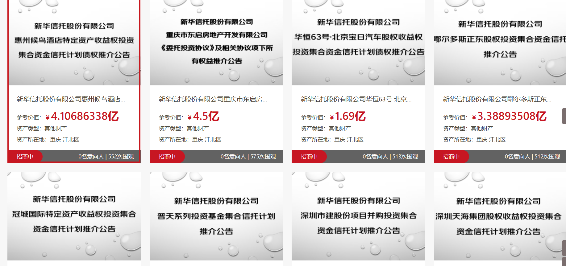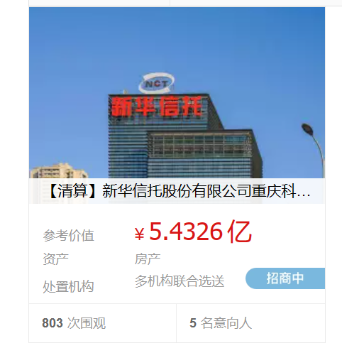 2023年8月,新华信托首批可处置资产上线京东及阿里两大拍卖平台。截至目前已历经第四轮拍卖,但因无人出价,最终以流拍告终。