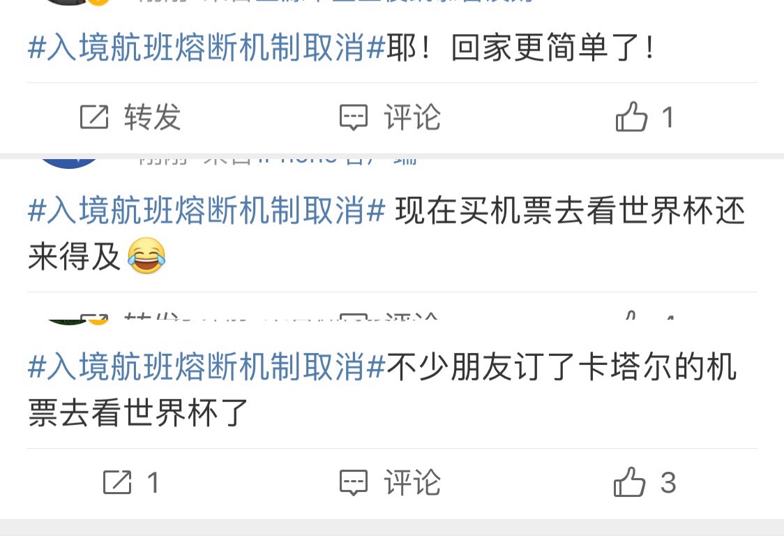 据悉,《通知》发布后,人们的旅游出行意愿迅速高涨。在微博平台上,网友们纷纷表达着喜悦之情:“回家更简单了”“现在买机票去看世界杯还来得及”。
