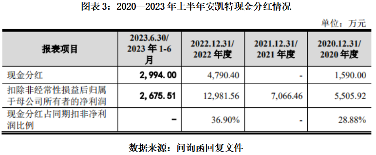 该公司创业板IPO的招股书(上会稿)、本次IPO的招股书(申报稿)及本次IPO的问询函回复文件显示,2019—2023年上半年,安凯特累计进行现金分红4次,对应的现金分红总金额为1.27亿元。