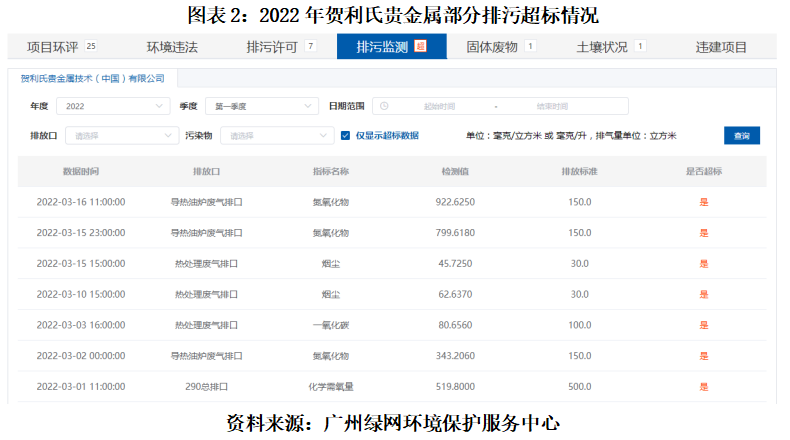 根据企查查资料,2019年10月10日,久恩金属因违反《食品安全法》,被昆山市市场监督管理局处罚5.00万元;2020年9月1日,贺利氏贵金属因违反特种设备使用监督管理规定行为,被南京市市场监督管理局罚款1.00万元;广州绿网环境保护服务中心官网显示,贺利氏贵金属作为环境监管重点单位,曾多次发生过排污检测超标的情况。