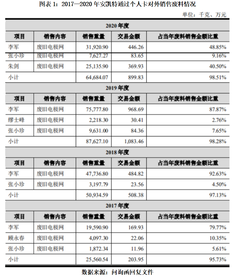 在问询函回复文件中,安凯特表示,2021年以前,公司废旧电极网处置的最终责任人为实控人徐文新。2019—2020年,公司发生废旧电极网销售产生的相关收入未及时入账等内部控制失效问题,主要原因在于该期间公司内部控制制度不完善、公司内部监督制度未能有效执行。