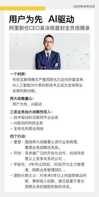 9月12日,阿里巴巴集团新任CEO吴泳铭发布全员信,宣布确立两大战略重心:用户为先、AI驱动。