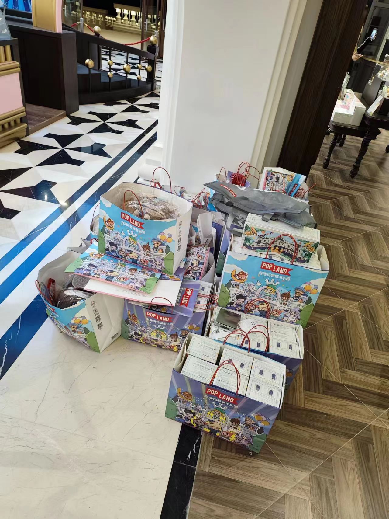 但这些并不足以消解黄玲对泡泡玛特乐园的狂热,“相比‘好玩’,对我来说乐园更‘好买’。”作为泡泡玛特忠实粉丝的黄玲介绍,乐园商店有许多限定的产品,包括发箍、斜挎包、双肩包等IP周边,还有限定的乐园盲盒套盒等等。内测入园当天,黄玲就花了超4000元买各种限定产品,其中原价690元的《乐园,集合!》盲盒套盒就购买了三盒。