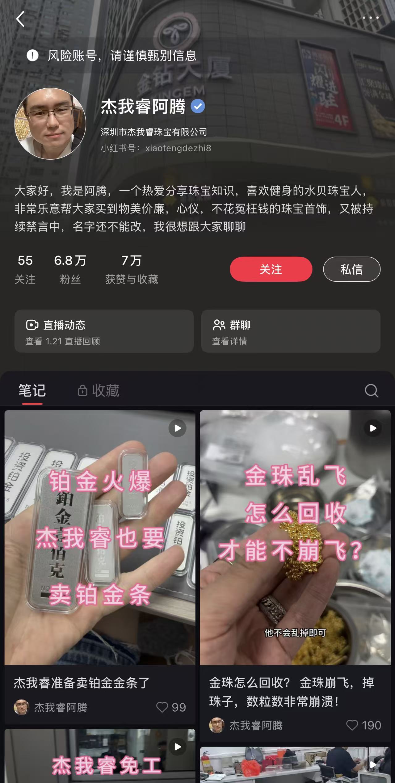 时代财经从采访中获悉,杰我睿的用户群体中不少此前自称“杰粉”,粉丝群叫做“杰我睿衣食父母”,拥有大批拥护者。天眼查信息显示,杰我睿成立于2014年6月,法定代表人、实控人为张志腾(持股90.9%),张志腾在小红书上拥有近7万粉丝,是水贝黄金圈小有名气的网红。