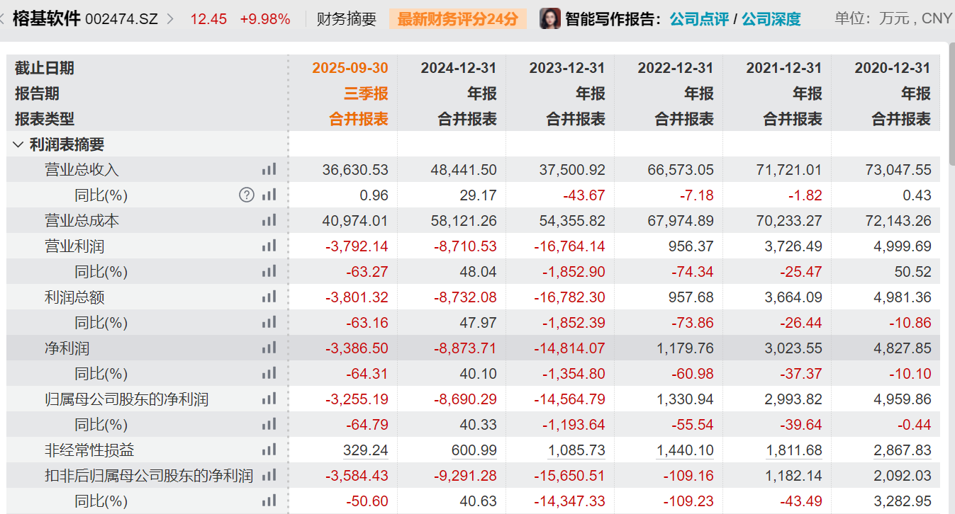 对此,榕基软件并未在2025年三季报中解释亏损原因,但在2025年半年度业绩预告里称,公司业绩主要受外部经营环境持续严峻,项目实施进度延后及回款滞后,以及较高的人力成本与资产摊销折旧压力等因素影响。