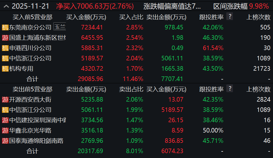 Wind龙虎榜数据显示,11月19日至20日,上榜营业部席位合计净卖出2047.77万元。具体来看,中信证券浙江分公司、国泰海通证券上海徐汇区宛平南路证券营业部分别买入4339.72万元、3287.64万元;国泰海通证券上海静安区新闸路证券营业部、国信证券北京分公司分别卖出9655.72万元、2357.02万元。