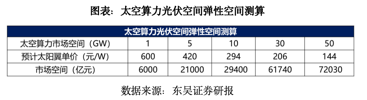 据东吴证券测算,若未来太空算力市场空间达50GW,太空算力光伏市场空间可突破7万亿元。