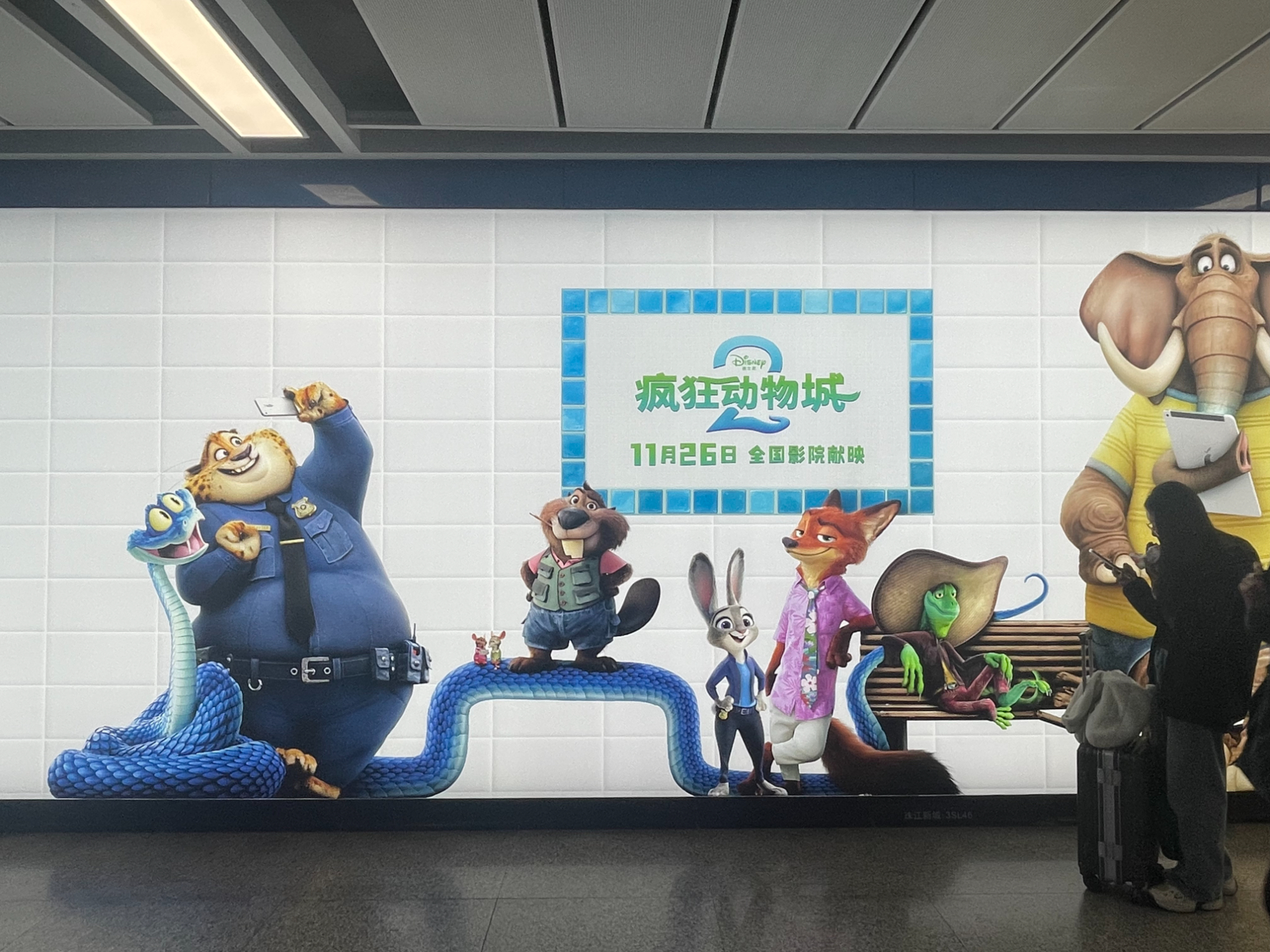 广州珠江新城地铁站的《疯狂动物城2》广告。时代财经摄。