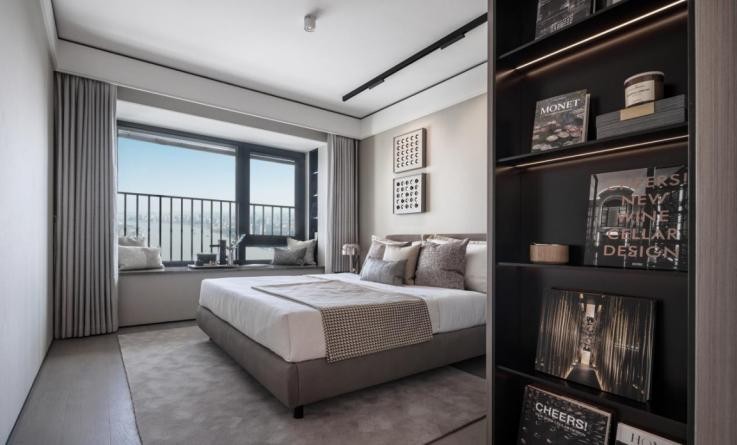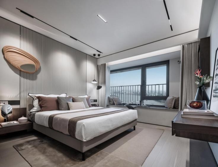 主卧室内设计彰显质感与雅致,背景墙流畅自然的皮革线条,再塑经典艺术美学。大尺度飘窗,当夜幕降临,城市景致与室内格调,在斑驳光晕中联动氤氲浪漫氛围,二人端坐大理石飘窗上品酒谈心,无尽舒适惬意。