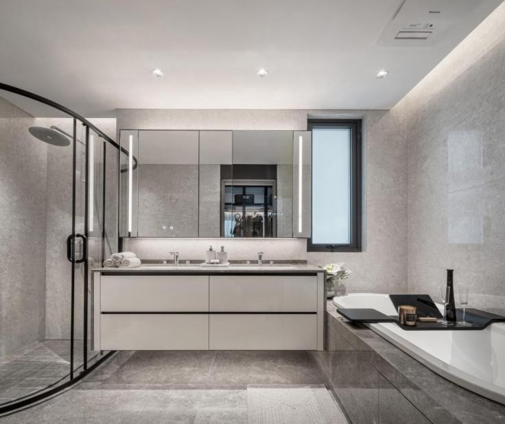 主卫明卫空间,采用了三段式设计,优化分区盥洗、卫生和洗浴三大功能,注重安全性、适宜性和易打理性。并选用全球顶尖奢华卫浴品牌,欧洲皇室御用经典,唯宝双台盆,TOTO智能马桶,德国卡德维浴缸,都是豪宅的配置。同时安装松下暖风机,让沐浴时刻始终温暖如春。而主卧暗藏的小细节在于淋浴空间双向门设计,镜柜辅以线型灯带,除雾打光兼具,内里仿布纹木饰面,这些看似小的设计巧思将给生活带来更大的舒心,也体现了招商云玺的“细节控”。
