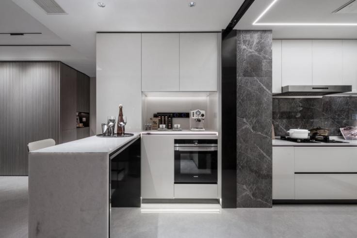宽敞U型厨房,又预留了西厨中岛洄游空间,满足业主在中餐和西餐之间惬意切换,完全契合了现代人生活习惯与生活理念。