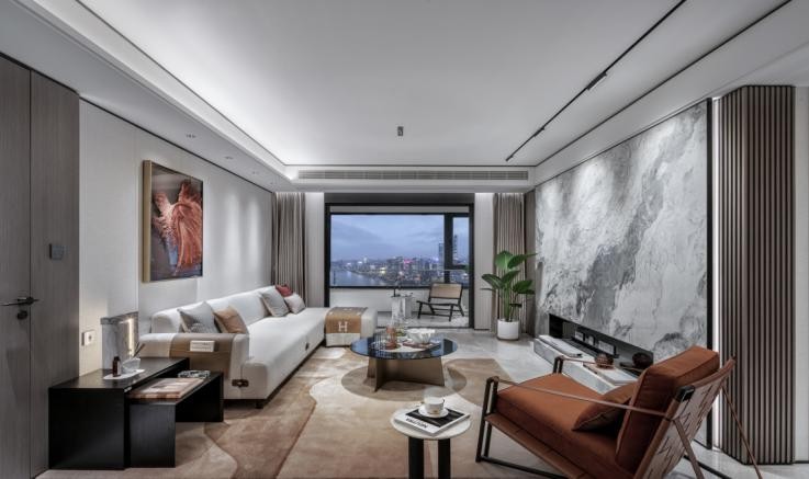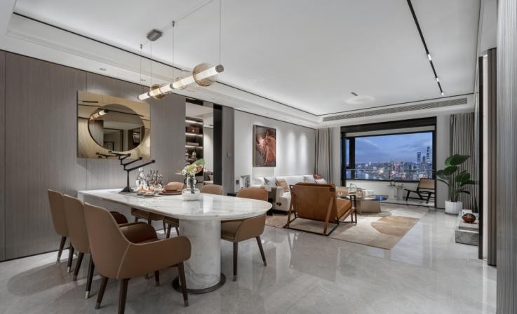 不止于尺度,客厅空间的艺术感更大有考究,电视墙甄选大尺寸岩板,呈现更具层次的视觉艺术,整体营造简洁优雅的气质,凸显高级感。