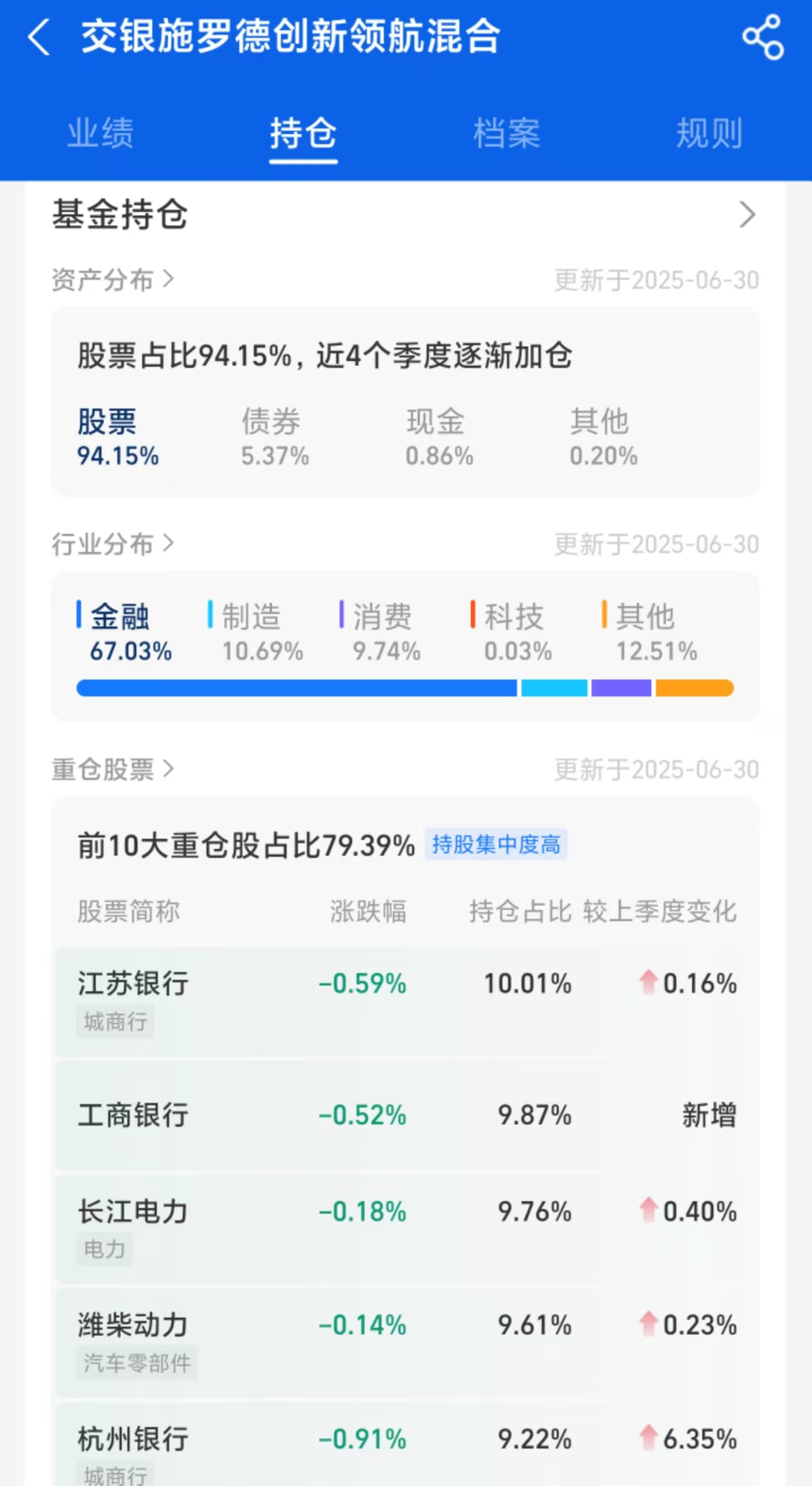 作为聚焦科技创新的主题基金,交银创新领航混合2025年6月末的十大重仓股中,有7只为银行股。江苏银行为第一大重仓股,持仓占比达10.01%;工商银行H股为第二大重仓股,持股比例为9.87%。此外还有杭州银行、建设银行H股、中国银行H股以及农业银行A股和H股。7只重仓银行股合计持股占比50.85%。