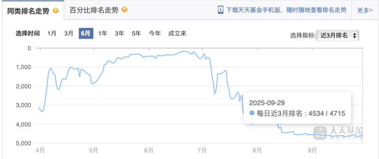值得注意的是,伴随着7月以来银行股普遍回调,该基金的业绩在行业内持续下滑。据天天基金网数据,截至9月29日,该基金近三个月在同类基金中排名为4534/4715。