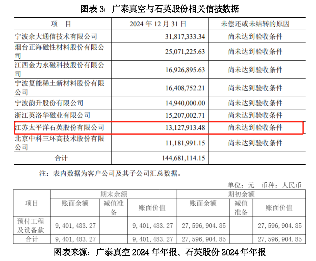 然而,石英股份2024年年报显示,2024年末,其“预付工程及设备款”总额仅940.15万元,与广泰真空披露的1312.79万元存在372.64万元的差额。
