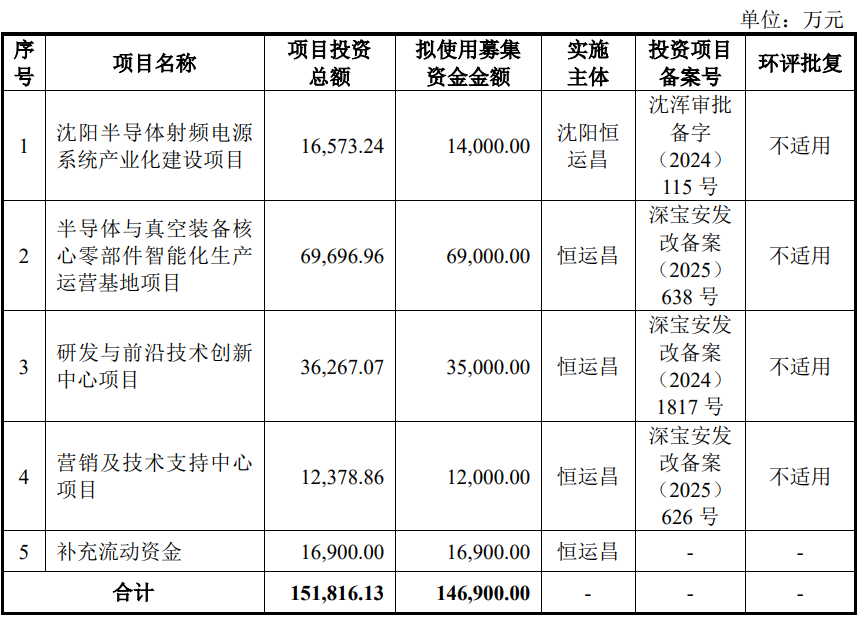招股书显示,恒运昌此次IPO拟募集资金14.69亿元用于沈阳半导体射频电源系统产业化建设项目、半导体与真空装备核心零部件智能化生产运营基地项目、研发与前沿技术创新中心项目、营销及技术支持中心项目的建设,以及补充流动资金。