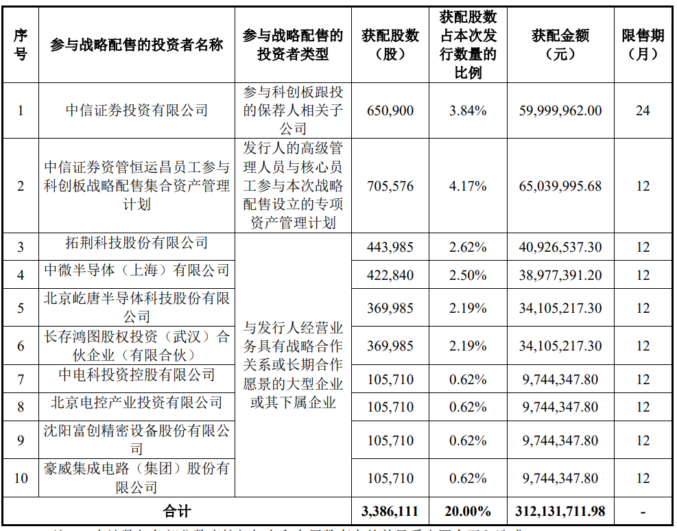 需要指出的是,拓荆科技还参加了恒运昌的战略配售,获配约44.4万股,占本次发行数量的2.62%。此外,中信证券资管恒运昌员工参与科创板战略配售集合资产管理计划获配股数最多,占本次发行数量的4.17%。
