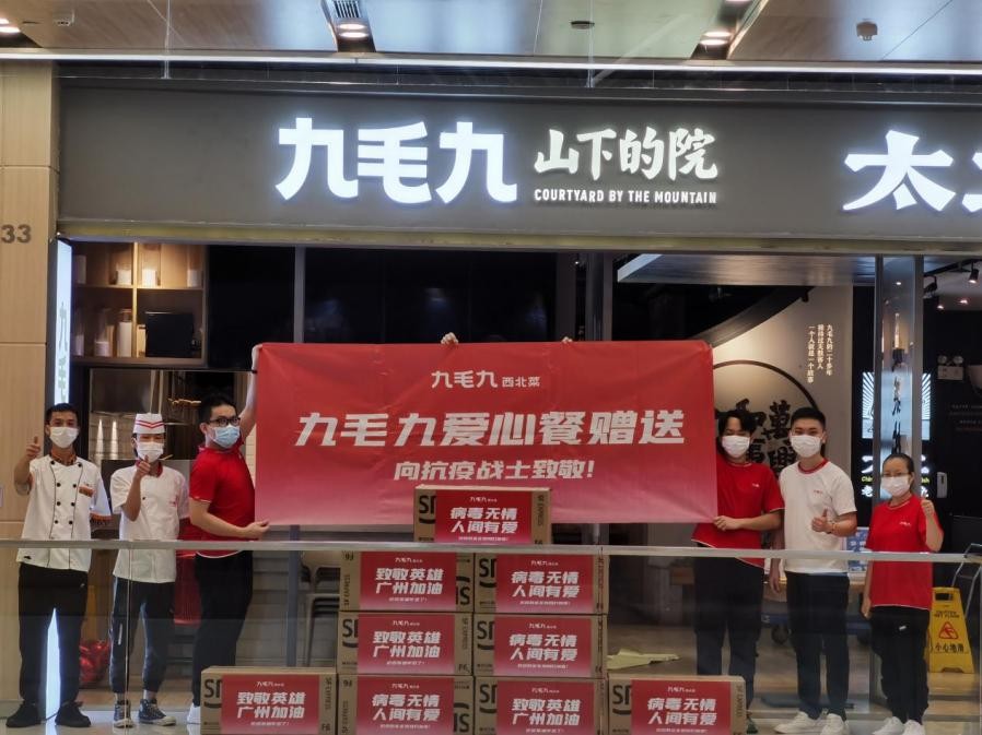2021年,面对疫情反扑,为响应国家抗疫决心,应广东省餐饮协会的号召,九毛九旗下品牌九毛九西北菜(黄沙店)从6.3—6.12期间为荔湾区浣南街东漖街道免费提供总计1400份爱心餐。