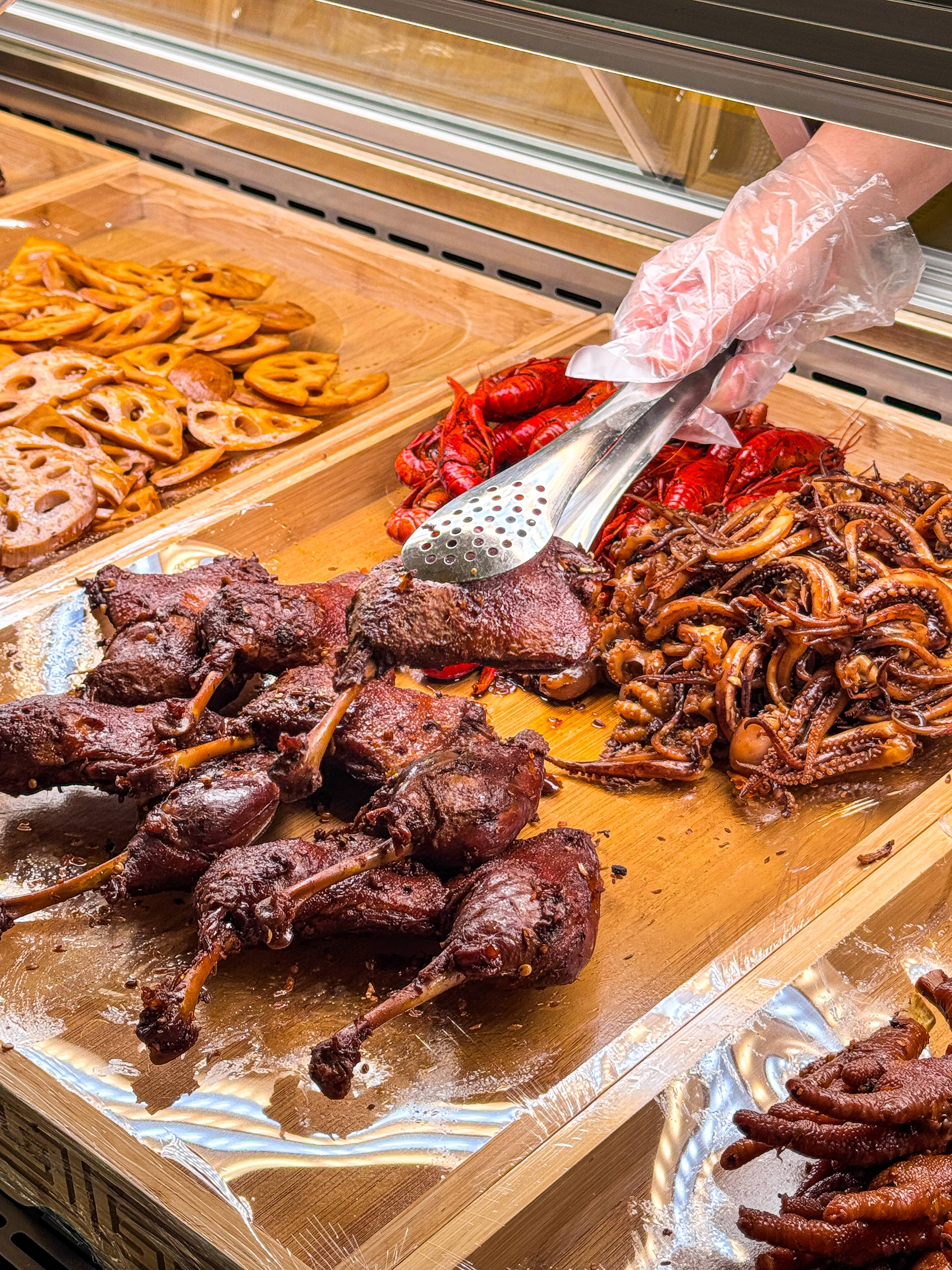 在产品策略上,周黑鸭海外首店在保留卤鸭脖、卤鸭锁骨等经典核心SKU的基础上,针对马来西亚市场进行了本土化创新。门店主推“整腿多汁、个大肉厚“的卤鸭腿及“鲜嫩肥美、劲道弹牙”的章鱼仔等明星单品,并新增海带结等素菜系列,同时引入小龙虾、鱿鱼须、扇贝等小海鲜品类。这一组合既坚守了周黑鸭“经典风味“的品牌内核,又通过丰富的选择贴合了当地消费者的多元口味需求,展现出灵活的产品策略。