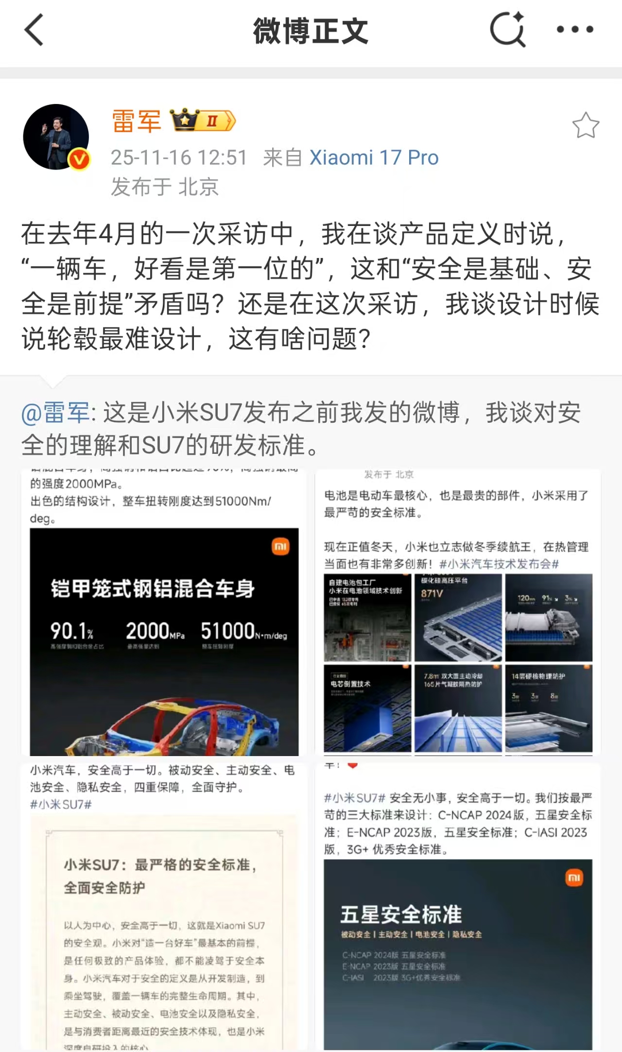 近日,“小米汽车,颜值比安全重要”相关话题在网络上引发争议。11月16日,小米集团创始人雷军连发多条微博澄清。雷军发文称:在去年4月的一次采访中,我在谈产品定义时说,“一辆车,好看是第一位的”,这和“安全是基础、安全是前提”矛盾吗?还是在这次采访,我谈设计时候说轮毂最难设计,这有啥问题?