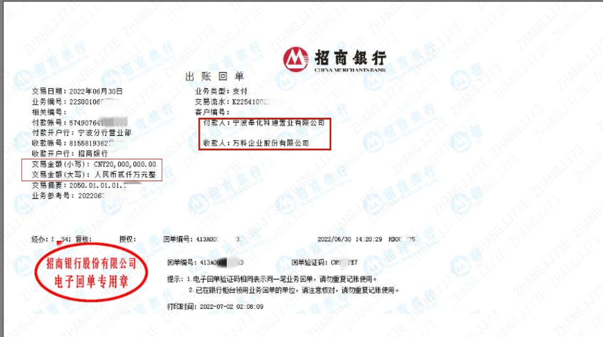 8月1日,宁波市奉化区法院出具受理案件通知书,决定立案审理一家合作方起诉万科的案件。