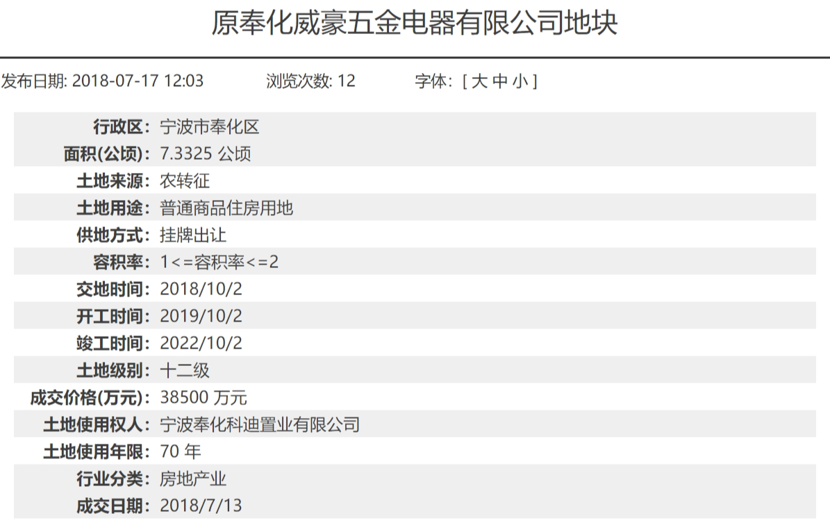据浙江省自然资源厅官网公示信息,原宁波奉化威豪五金电器有限公司地块2018年7月13日由奉化科迪以底价3.85亿拍得。
