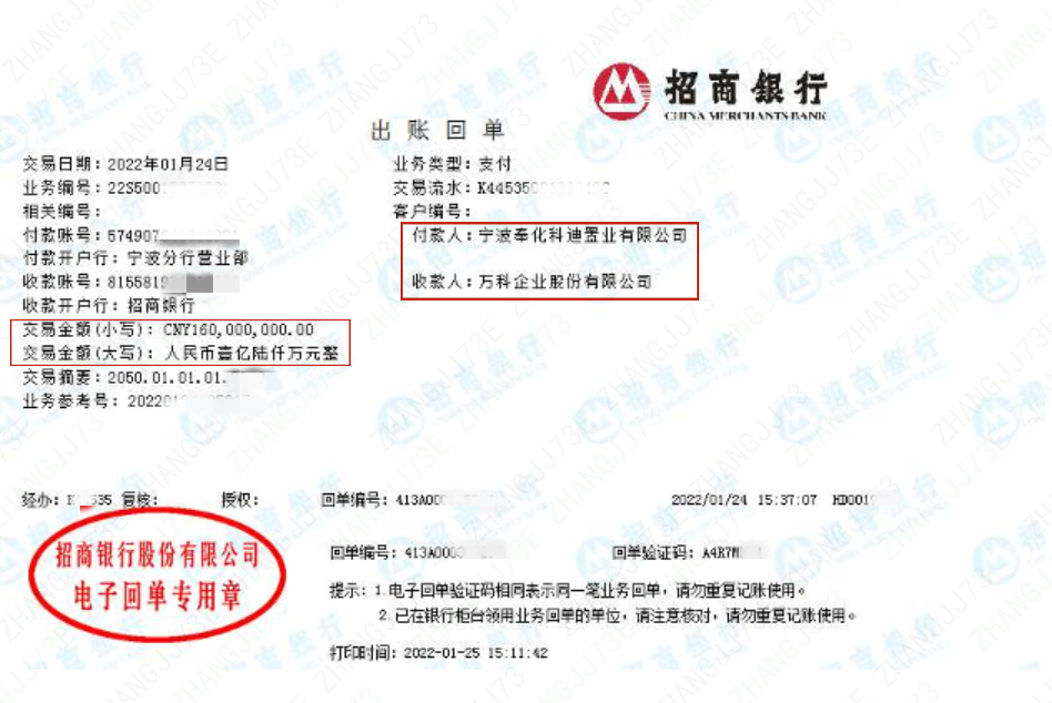 协信远致方面表示,万科在向奉化科迪的各股东提交的报表中,把已经划走的资金列入银行存款,实际转给了万科企业股份有限公司。并出示了两笔由奉化科迪向万科企业股份有限公司转账的银行流水,合计1.8亿。