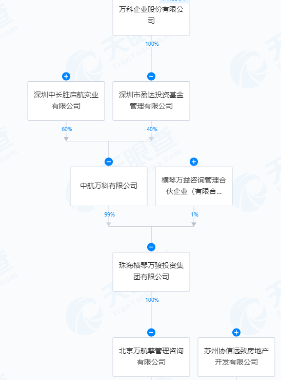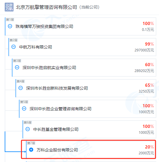 天眼查显示,持有项目公司35%股权的北京万航的股东向上穿透两层,是一家中航万科有限公司,目前万科企业间接持有40%的中航万科股权,深圳中长胜启航实业持有60%的中航万科股权。