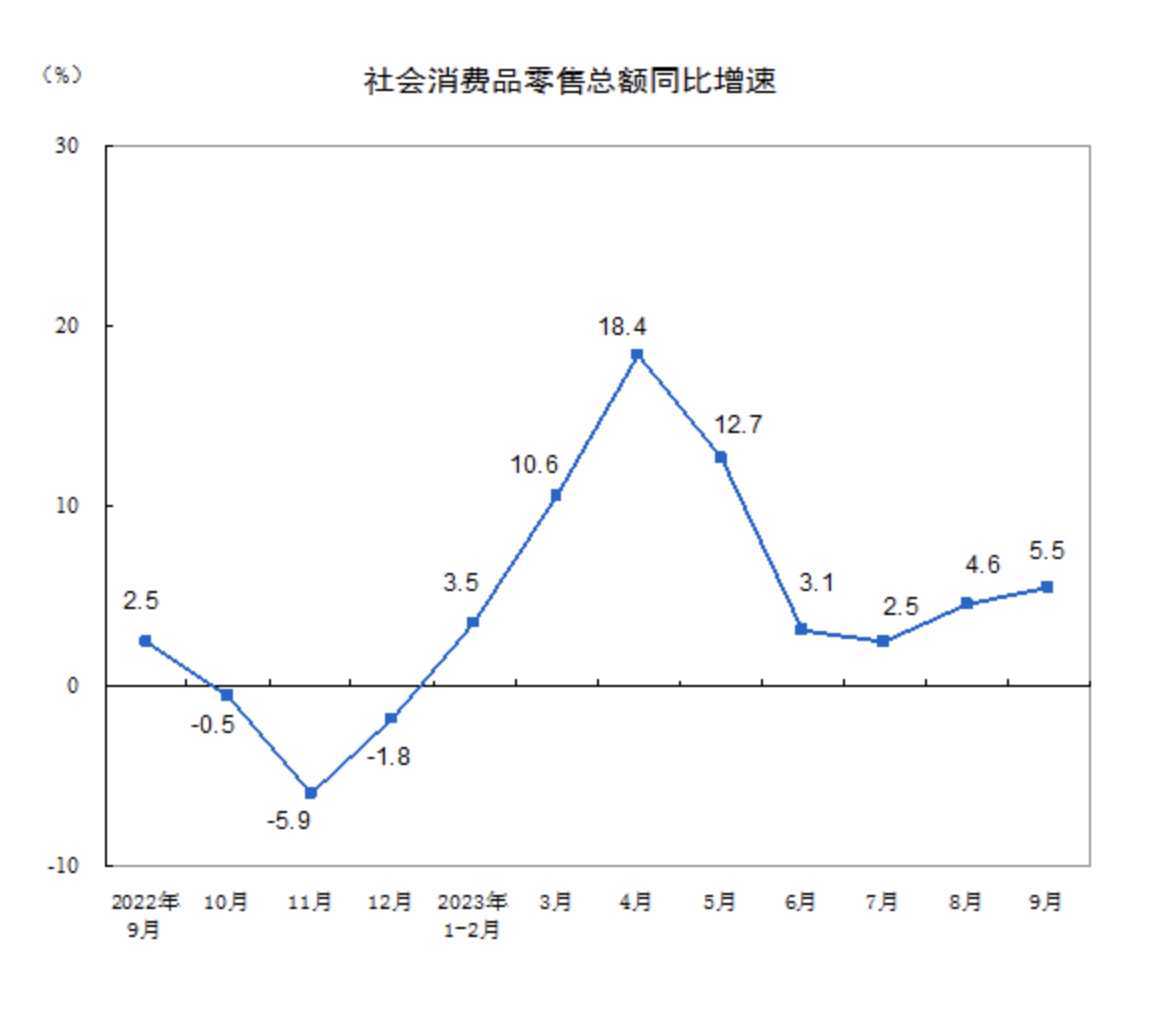 前三季度,社会消费品零售总额342107亿元,同比增长6.8%。9月份,社会消费品零售总额同比增长5.5%,比上月加快0.9个百分点,增速更是连续2个月加快,创下今年6月以来新高。