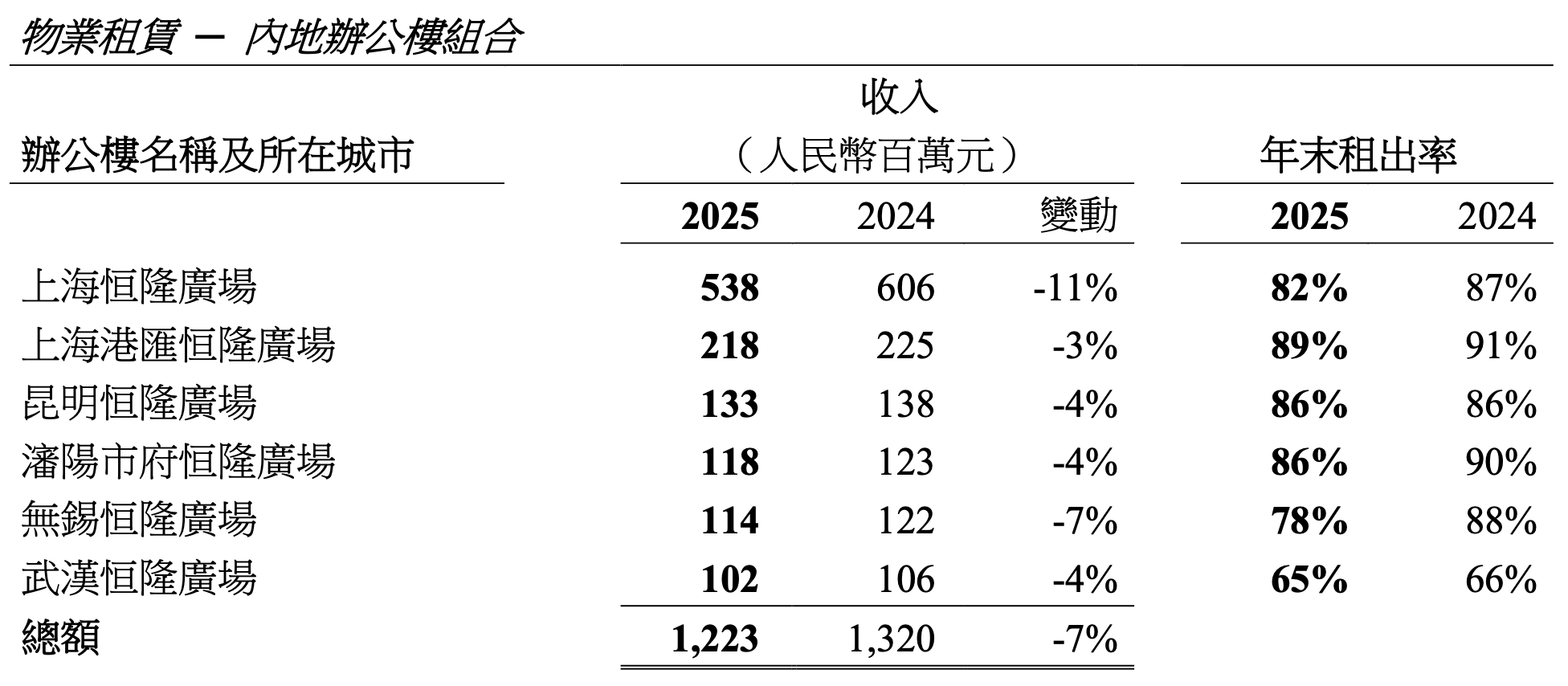 恒隆内地办公楼项目收入及出租情况,图源:恒隆集团财报