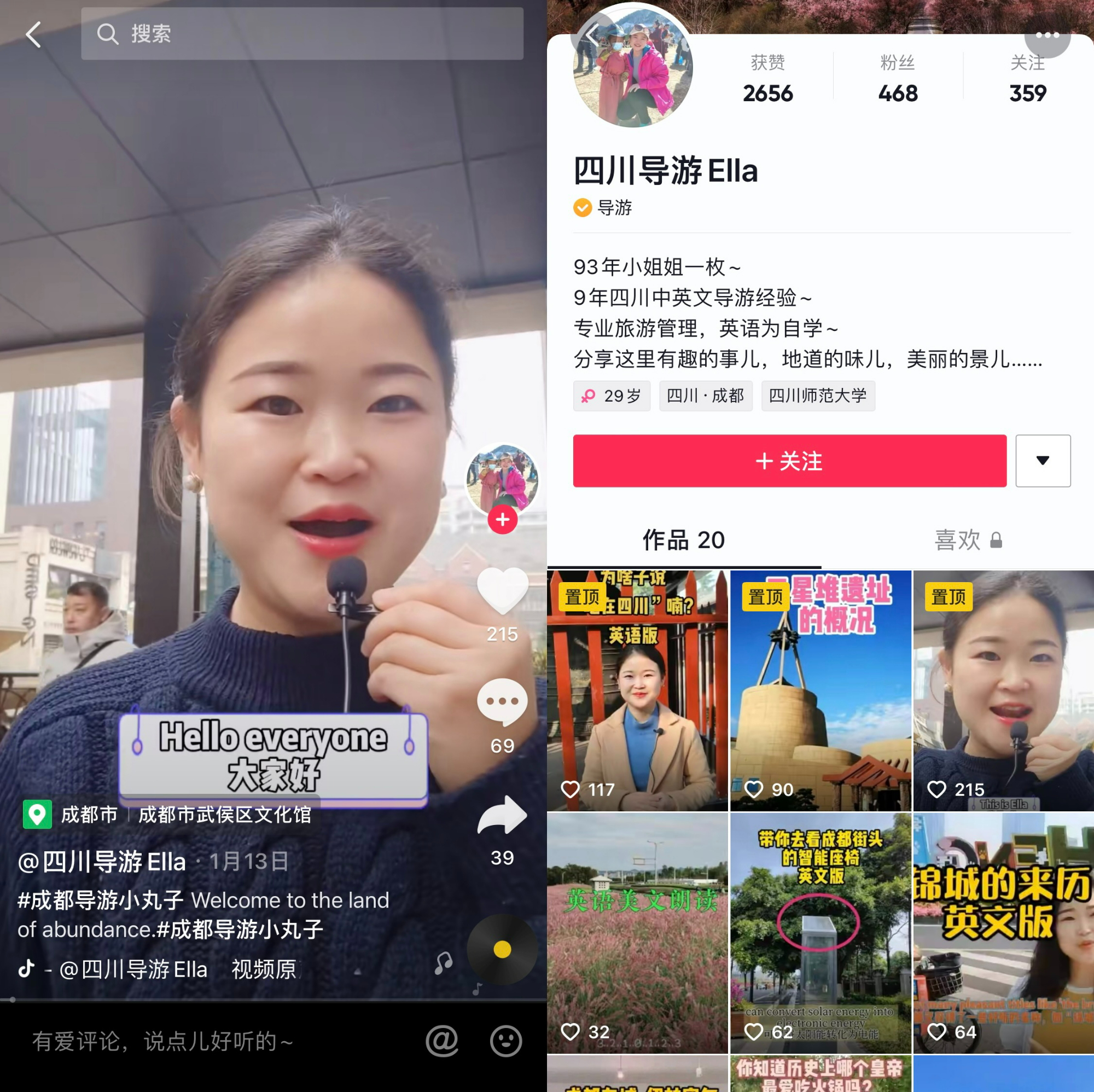“今天,我将向你介绍一些关于成都的事。”疫情影响下,四川游客寥寥,小丸子不得不拿着“小蜜蜂(注:导游专用讲解器代称)”从线下走到线上,2022年1月份,她在抖音发布了自己的第一条视频。4个多月过去,她的抖音账号拥有近500个粉丝,获赞超2600。