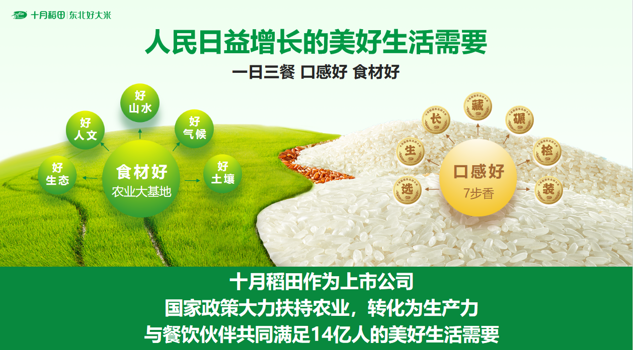目前,中国餐饮行业进入快速恢复期,这也带动餐饮供应链发展进入新阶段。十月稻田深耕行业十余年,凭借对客户需求的深入洞察、多链路的运营模式、优质粮食产地的战略布局及广泛渠道的销售网络,成功打造出一个成熟的全链路供应体系,为更多的终端餐饮企业提供强大的支撑和保障。