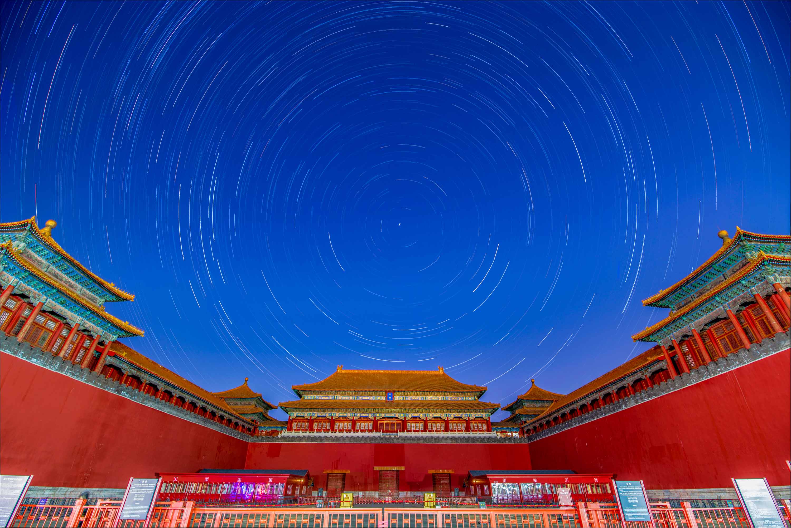 他的镜头有最直观的证据——在故宫午门架起相机,两三个小时就能捕捉到流星划过宫殿的清澈星轨大片。