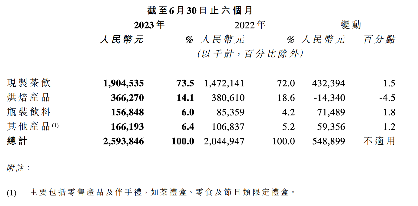 2023年中报显示,截至6月30日,奈雪的茶瓶装饮料与包括零售产品及伴手礼在内的其他产品,营收占比为6%与6.4%,同比上升1.8%与1.2%。而2022年全年,奈雪的茶瓶装饮料、茶礼盒、零食及节日类限定礼盒等业务的营收占比则同比增长5%。