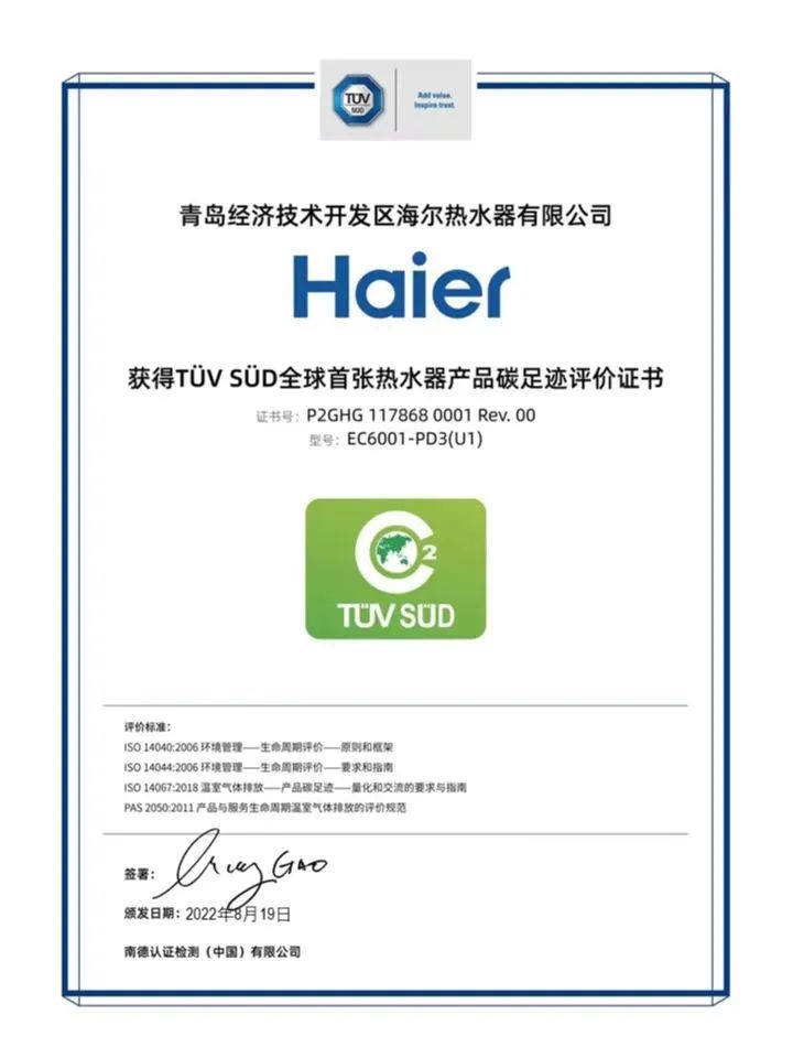 如今,杨春涛团队助力实现“双碳”目标,积极投身于海尔水联网“零碳”技术探索,已完成全球首张从“摇篮”到“坟墓”的热水器产品碳足迹认证,推进组织碳核查工作。